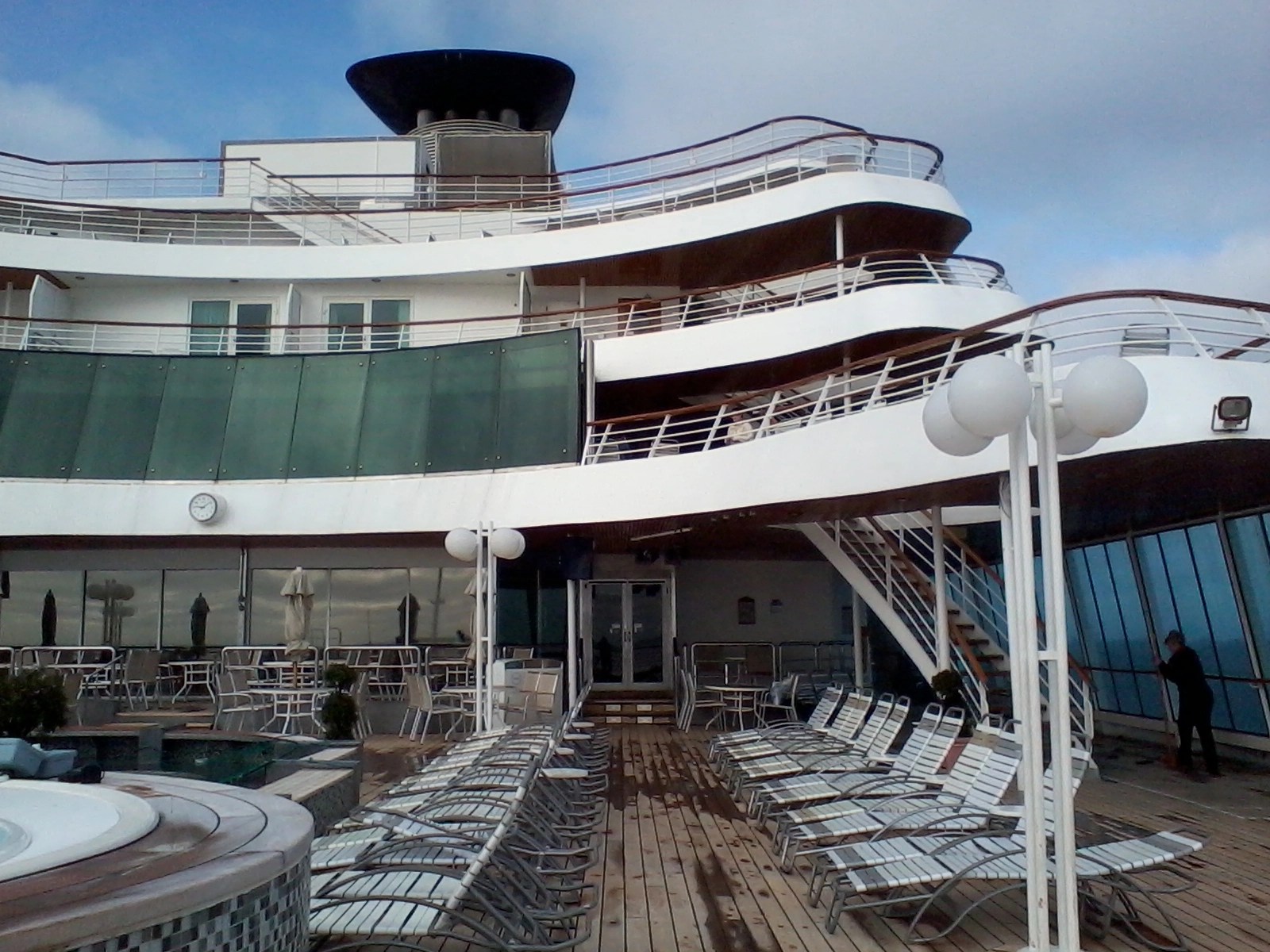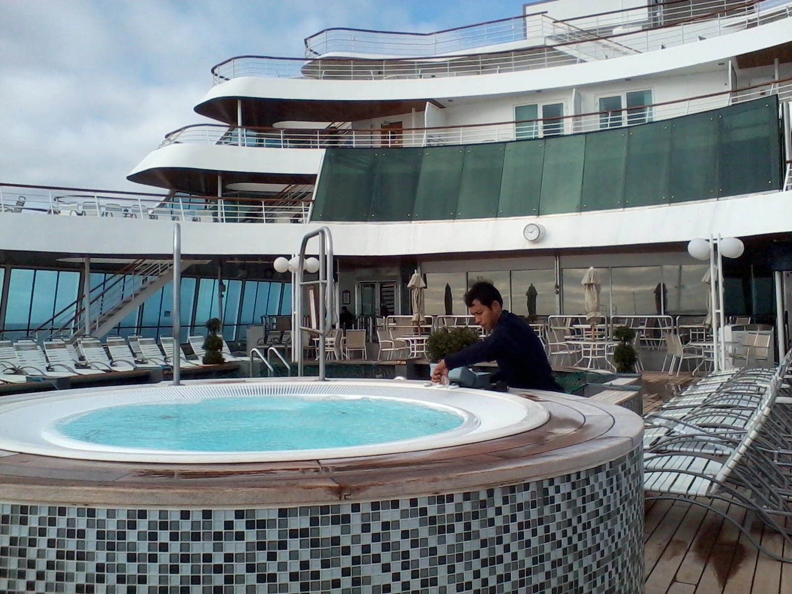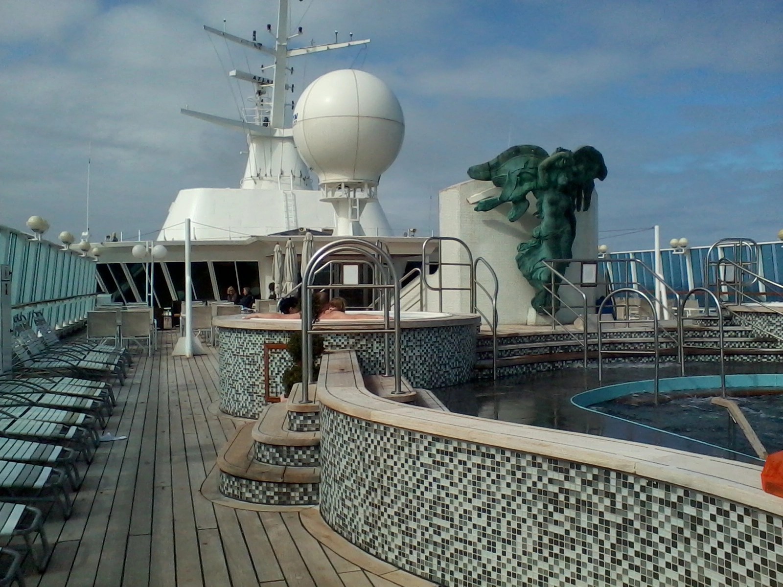 After the talk we then went for a coffee in the Palms Café, had a look around the shops then ventured out on deck. It was still quite windy but at least there wasn’t as much spray about and the deck was dry. You could have had your pick of the sun loungers though. 🙂