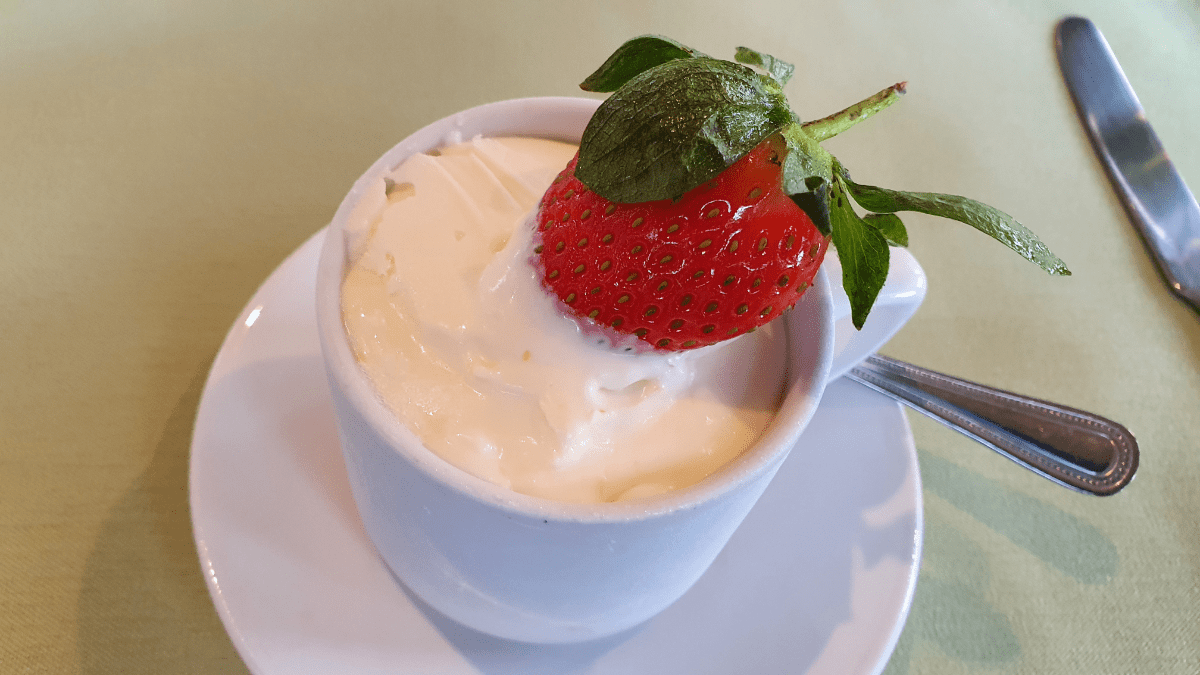 Dinner, as ever, was delicious and consisted of the poshest fish ‘n’ chips we’ve ever had: a melt-in-the-mouth lemon sole, minted mushy peas and hand-cut skin-on chips. This was followed by a lemon and Limoncello ice cream topped with a fresh strawberry, and finally the yummy cheeses, where I sampled a Scottish blue cheese called “Blue Murder” and a mature cheddar with truffles. It was all washed down with chilled house white wine, and followed by the inevitable whisky.