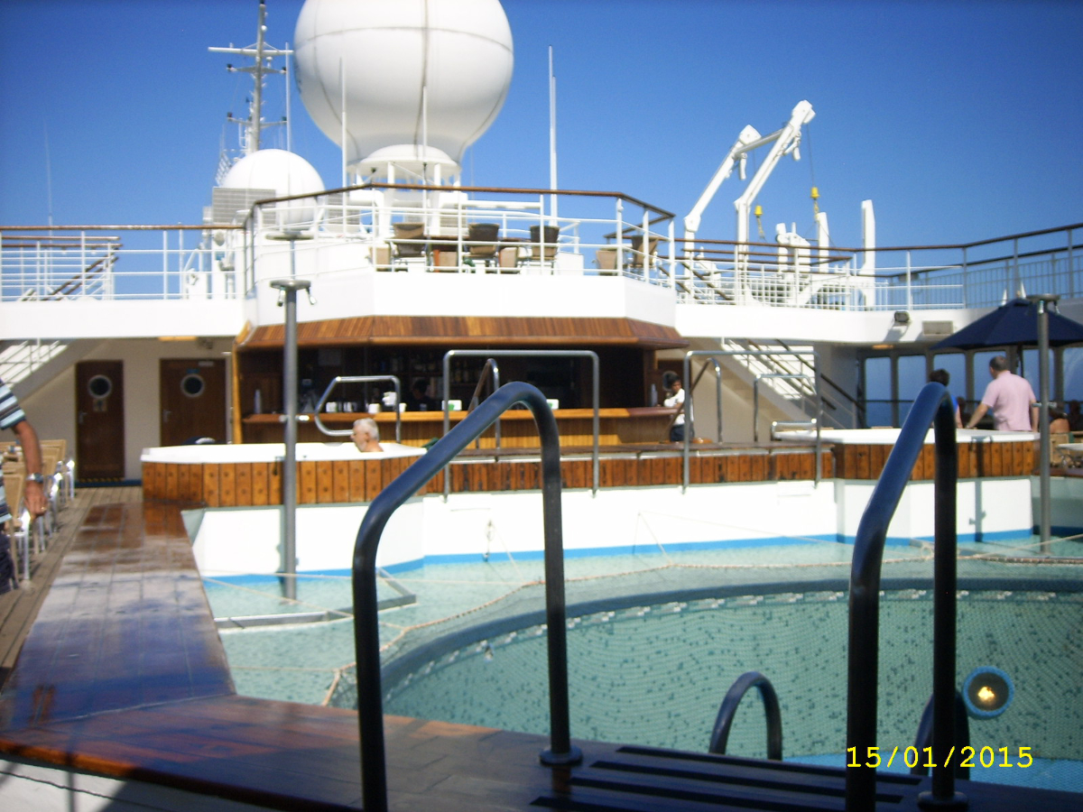 We dumped our bags in the cabin and, as our cases hadn’t arrived yet, we decided to go up to the pool deck in the tropical sunshine and enjoy a freezing cold beer. We ordered a pint of Boddington’s each and sat under the welcome shade of a parasol over our table, looking around us with interest. The pool was circular and not very deep (1.4m) – more of a plunge pool than anything, and we enviously watched people going in for a swim in the gorgeous cool water.
