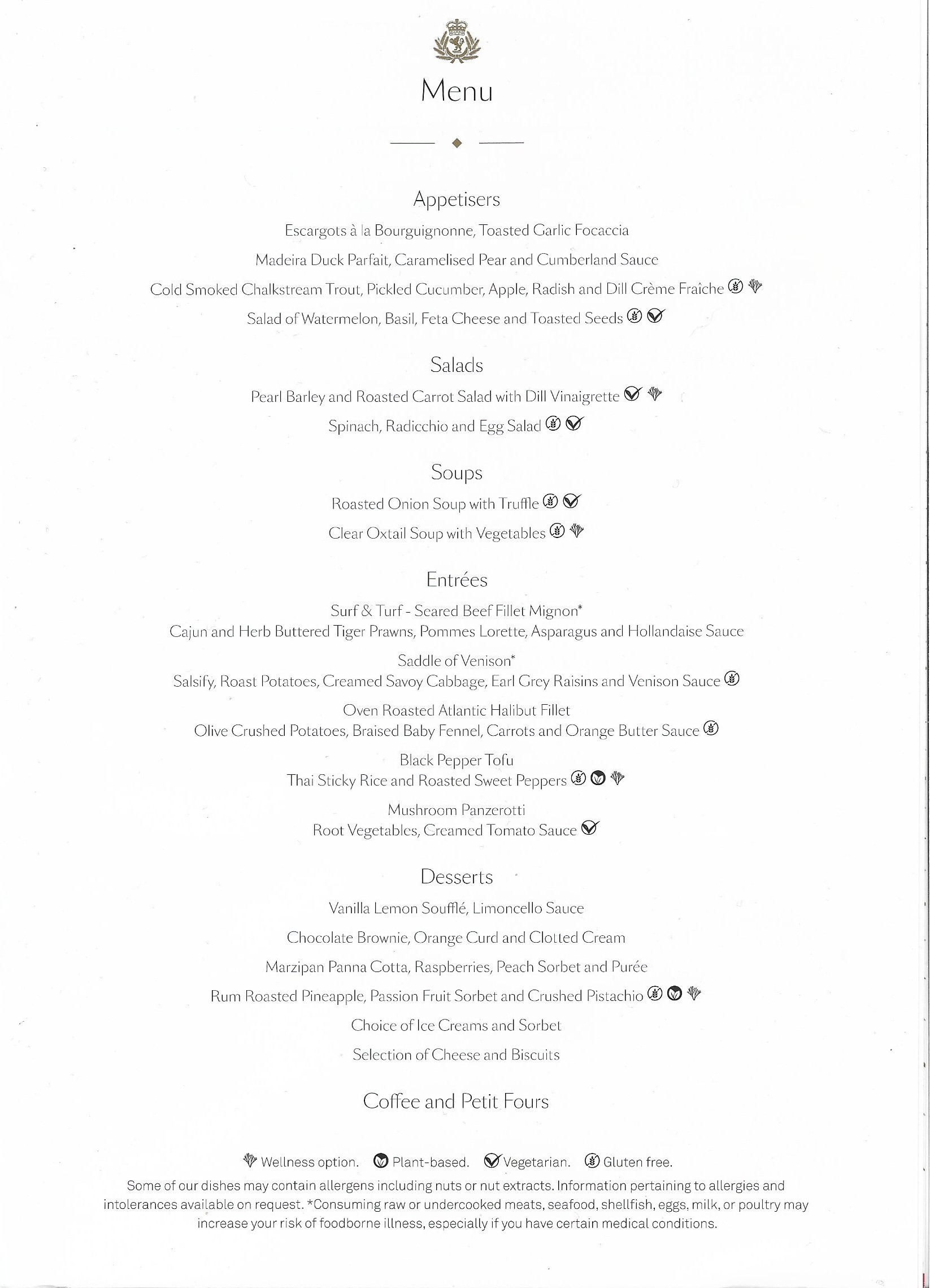 As we took our seats at the table, our waiter handed us a special souvenir menu which not only included the culinary offerings on for tonight, but also outlined a little of the Cunard line’s illustrious history over the years. You can view/download the menu here.