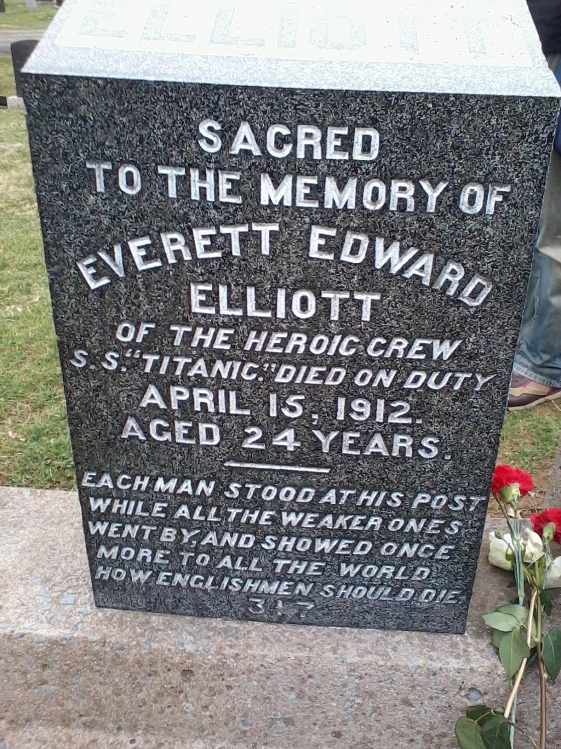 In the cases where the bodies were known and claimed by relatives, larger and more elaborate head stones were in evidence, with touching epitaphs. One of them was the grave of John Law Hume, who had been one of the heroic bandsmen. There was a gorgeous floral tribute with a violin set into it and his photograph at the base of the tribute. It had the words “He played on as the ship went down” and a note was left from a Yvonne Hume, obviously a descendant. It was really lovely.